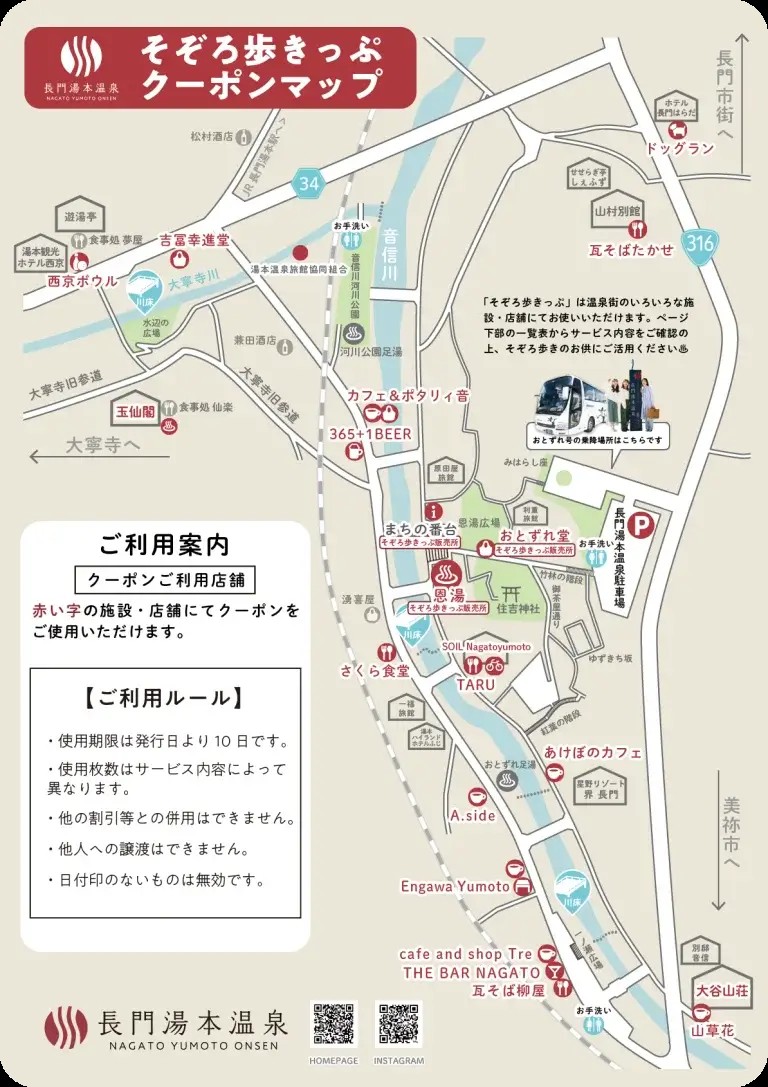 長門湯本温泉「そぞろ歩きっぷ」は、温泉街のいろいろな施設・店舗にてお使いいただけるお得なクーポンセットです。温泉ご入浴から、各店舗でのドリンク、スイーツやアクティビティでのご利用まで、幅広くご利用いただけます。